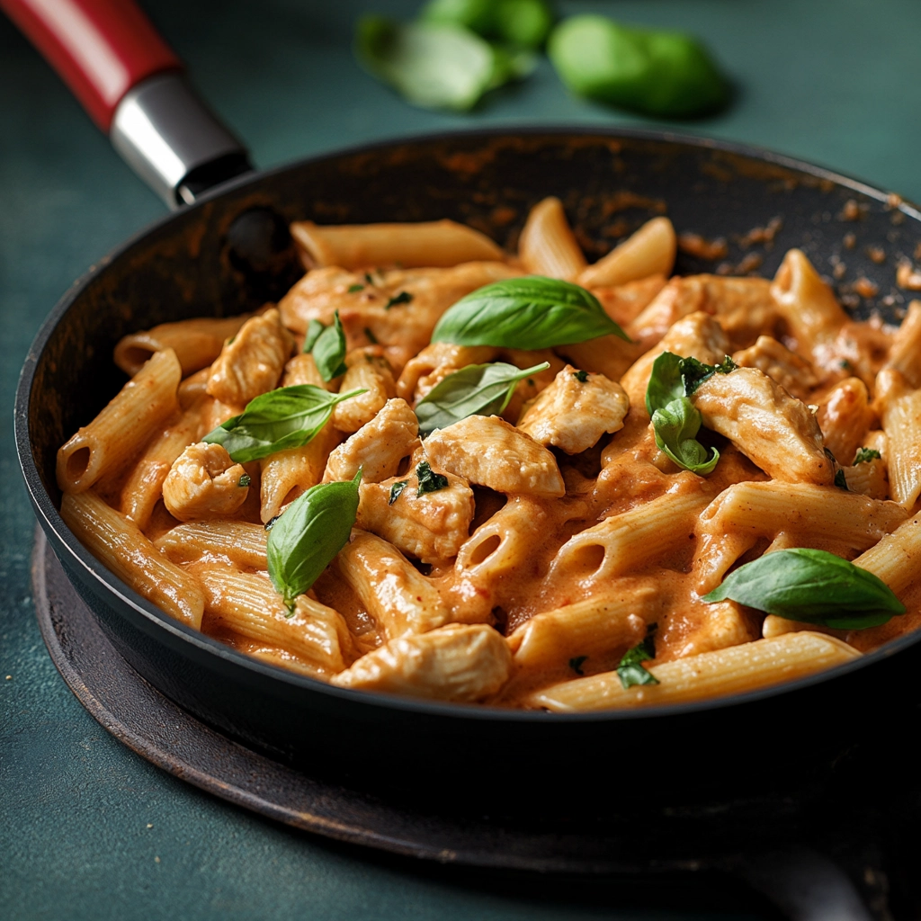 - Yhdistä: Lisää keitetty pasta pannulle kastikkeen kanssa ja sekoita hyvin. Lisää kanan suikaleet ja sekoita varovasti. Tarvittaessa lisää hieman pastan keitinvettä, jotta saat halutun koostumuksen.