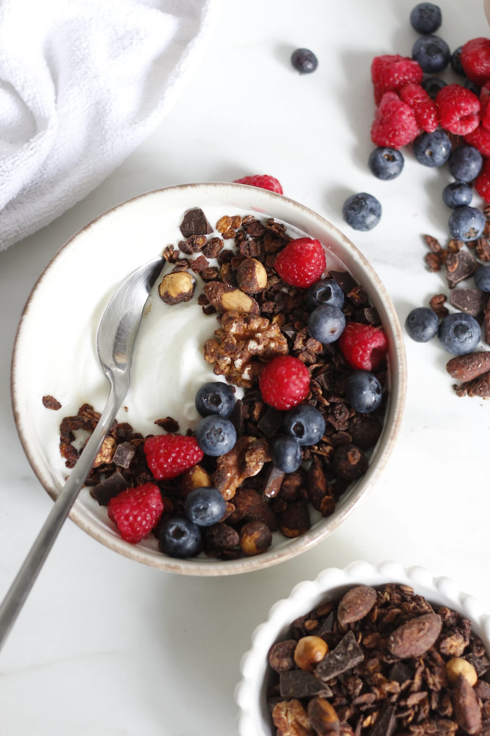 - Ripottele maustamattoman, kreikkalaisen tai kasvipohjaisen jogurtin päälle rapeaksi aamiaiseksi.