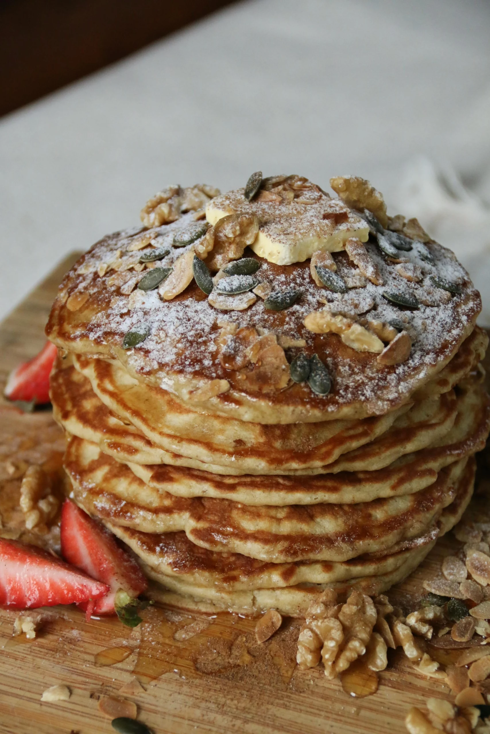 Herkullisen kuohkeat ja terveelliset kurpitsa-kaurapannukakut. Täydellinen aamiainen syksyisiin aamuihin – valmistettu ravitsevasta kaurasta, pehmeästä kurpitsasoseesta, lämpimästä kanelista ja proteiinilisästä.