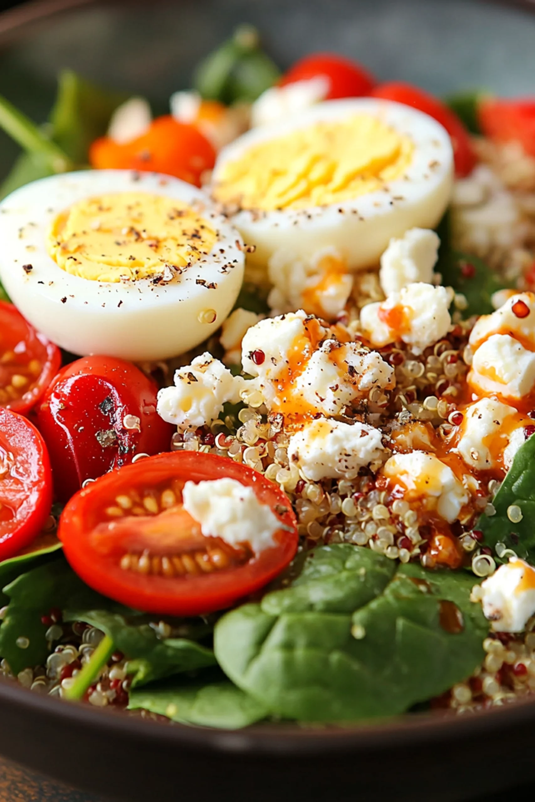 - Yhdistä suuressa kulhossa pinaatti, jäähtynyt kvinoa, tomaatti, kananmunat ja paprikat. Valuta päälle hieman oliiviöljyä ja lisää ripaus suolaa. Lisää juusto päälle ja kaada hunaja-sinappikastike salaatin päälle. Sekoita varovasti ja tarjoile.